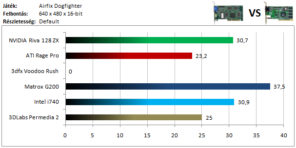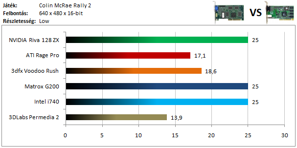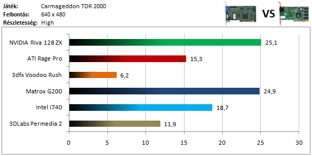A legkisebb kártyák 25 FPS-nél valamiféle limitbe ütköztek. A Voodoo Rush szereplése a grafikonon egészen biztatónak tűnik, de esetében textúra hiányok rontották az összképet.