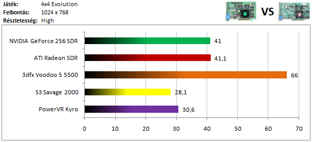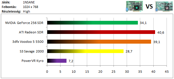 Az idei csúcskártyák csatáját a Radeon nyeri, mögötte nem túl nagy lemaradással a Voodoo 5 fut be másodikként. A dobogó alsó fokára a GeForce fért fel, míg a Savage 2000 lemaradása már jelentős. Ennél is sokkal nagyobb verést kap a Kyro, melynek egyedi felépítését nem kedvelte ez a játék, és a borzalmasan gyenge sebesség mellé még textúrahibákat is produkált.