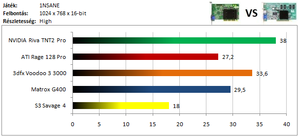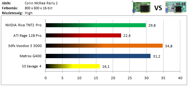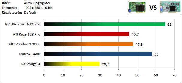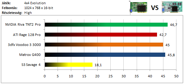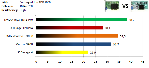 A TNT2 magabiztos előnnyel vezet a Voodoo 3 előtt, míg a harmadik helyet a Matrox G400 szerzi meg. A Savage 4 lemaradása szokás szerint hatalmas.