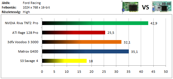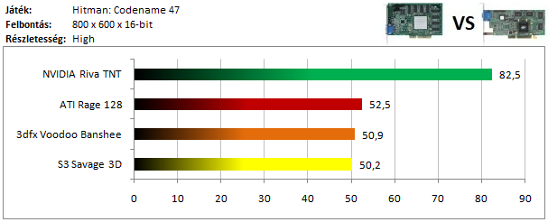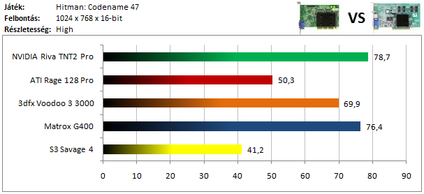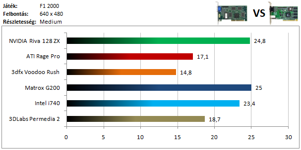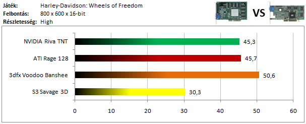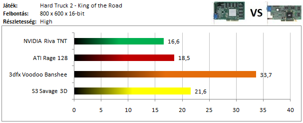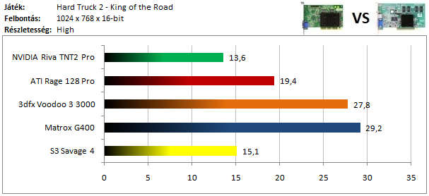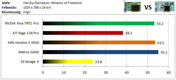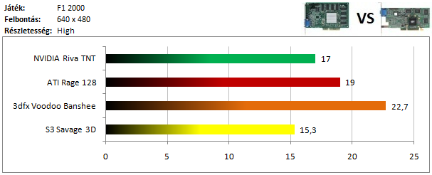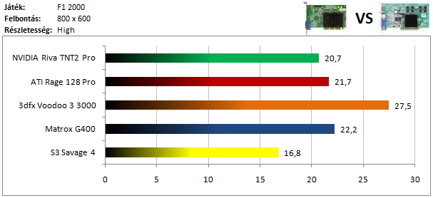 A TNT2 egy hajszálnyival ugyan, de legyőzte a Matrox G400-at ebben a tesztben, míg a dobogó alsó fokára a Voodoo 3 állhatott fel. A Rage 128 Pro teljesítménye elég harmatos, hiszen alig volt csak képes megelőzni a Savage 4-et.