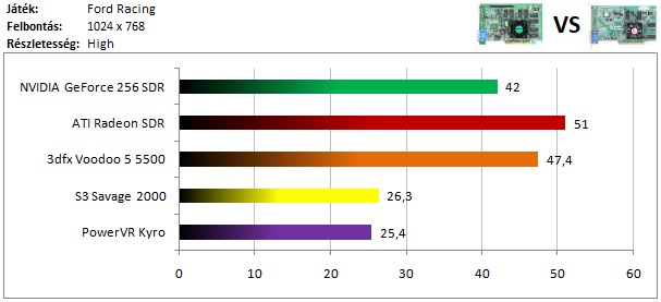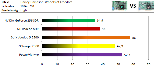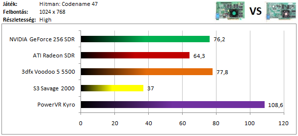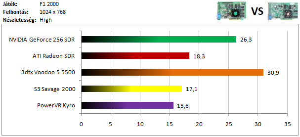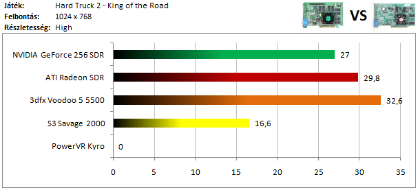 A legerősebb kártyák mezőnyét a Radeon vezeti, de a Voodoo 5 lemaradása sem hatalmas. A GeForce kicsivel nagyobb hátrányt szedett össze a harmadik helyen, de így is köröket ver a Savage 2000 és a Kyro alkotta párosra, hiszen ezekkel a kártyákkal nem kapunk játszható sebességet 1024x768-as felbontásban.