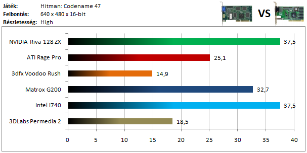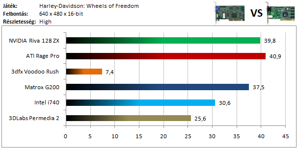 A Riva 128 és az Intel i740 V-Sync limitbe futott, és rajtuk kívül még a Matrox G200 volt képes játszható sebességgel futtatni a programot.