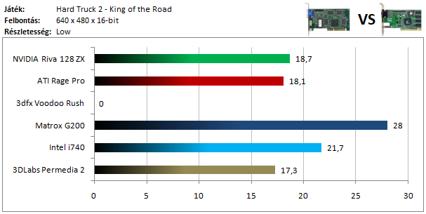 A legkisebb kártyákkal már csak alacsony grafikai szinten van értelme próbálkozni, és így is csak az első három helyezett képes játszható sebességgel szolgálni. A Matrox G200 mögött hatalmas meglepetésre az ATI Rage Pro fut be, míg a dobogó alsó fokára az Intel kártyája állhatott fel. A Riva 128 ezúttal nem szerepelt túl jól, a Permedia 2 és a Rush pedig (ebben az időszakban már megszokott módon) a közelében sincs annak, hogy megfelelő sebességgel futtassa ezt a játékot.