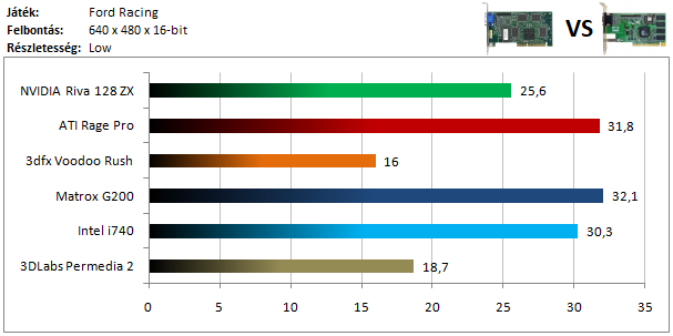 A legkisebb kártyák ezúttal is valamilyen rejtélyes 25 FPS-es limitbe futottak. A Matrox és az NVIDIA kártyája is elérte ezt a határt, sőt még az i740 is közel került hozzá. A többi versenyzővel egyáltalán nem volt esély játszható sebességre.