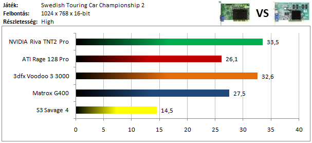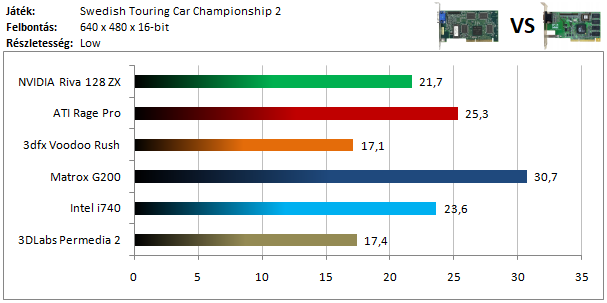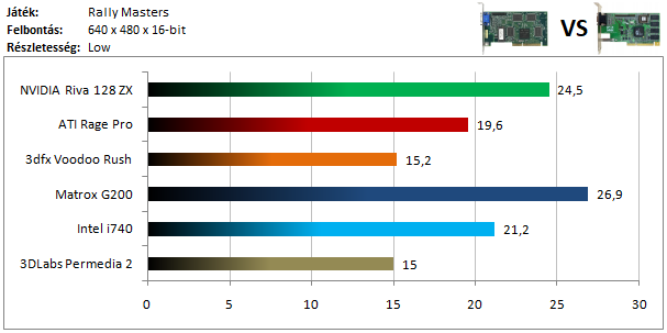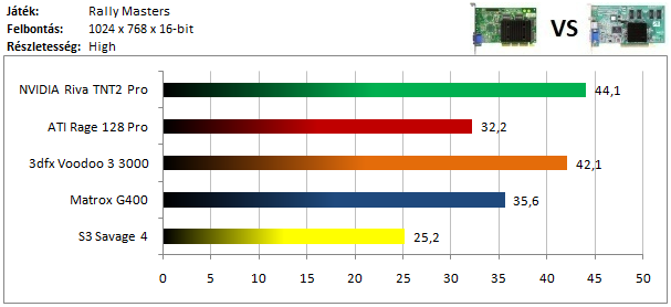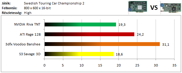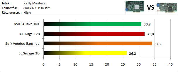 A legkisebb kártyák közül egyik versenyző sem adott tökéletesen játszható sebességet, de hozzá kell tenni, hogy egy több autót megjelenítő rallycross verseny nyitó jelenetével végeztem a mérést. Egy sima, egyszereplős gyorsasági szakasz esetén jóval kedvezőbb eredmények születtek volna, hiszen én annak idején rengeteget játszottam egy Riva 128-on ezzel a játékkal, és nem emlékszem sebességproblémákra.