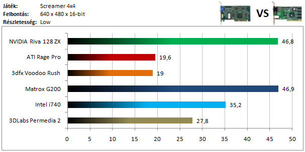 OpenGL-ről lévén szó, a legkisebb kártyák között tarol az NVIDIA versenyzője, de a Matrox és az Intel kártyájával is jól játszható sebességet kapunk. A Permedia 2-vel textúra hiányok jelentkeztek, a Voodoo Rush pedig szokás szerint élvezhetetlenül lassú volt.