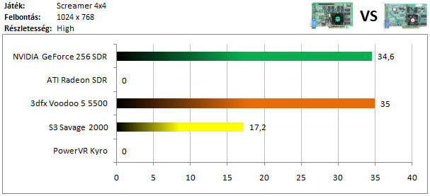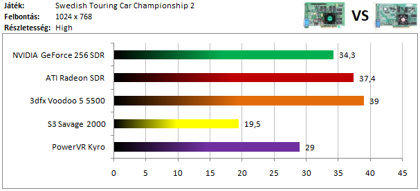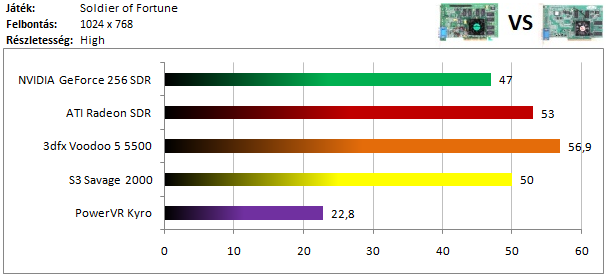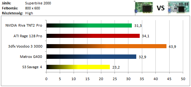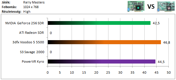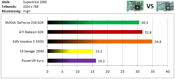 A sort a Voodoo 5 vezeti, mögötte a Radeon és a GeForce végzett, nagyjából azonos különbséggel. A Kyro lemaradása már jóval nagyobb mértékű, de az igazán gyenge teljesítményt a Savage 2000 mutatta be a sor végén.