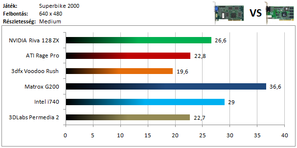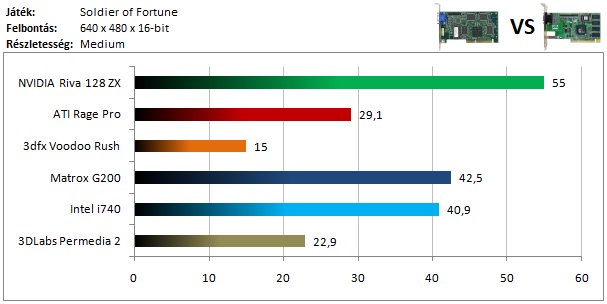 A legkisebb kártyákkal már közepes részletesség mellett sem kapunk jó sebességet, egyedül a Matrox G200 közelítette meg a V-Sync limitet. Rajta kívül az Intel i740 szerepelt még tűrhetően, de a többi szereplő esetén a grafika minőségének további csökkentésére lenne szükség.