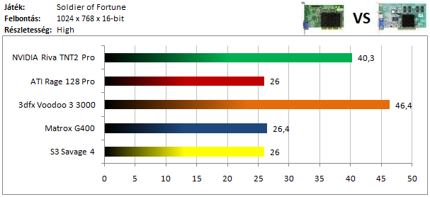 A Radeon és a Kyro kártyával is lefagyott a program, így kissé foghíjas lett a csúcskártyák mezőnye. A Voodoo 5 és a GeForce szinte azonos eredményt ért el, a Savage 2000 viszont hatalmas lemaradásban követi őket.