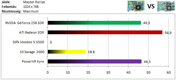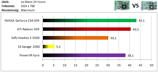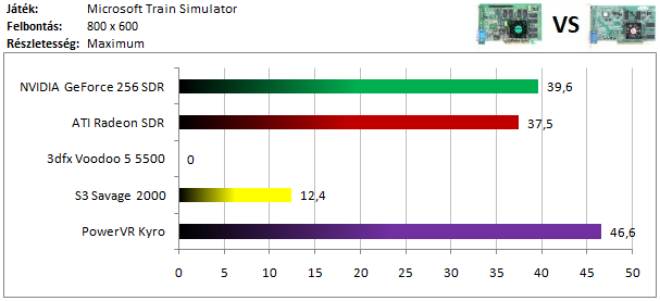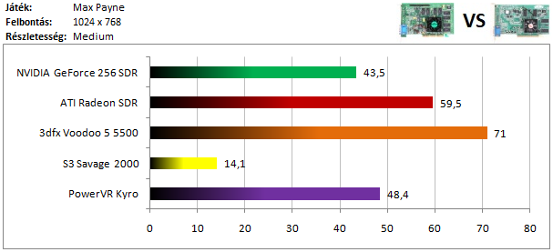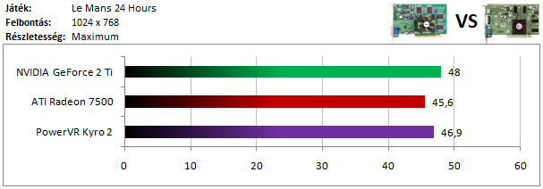 A GeForce mögött kis lemaradással a Kyro futott be másodiknak, ami hatalmas fegyvertény tőle, hiszen jócskán megelőzte a Radeon 7500-at.