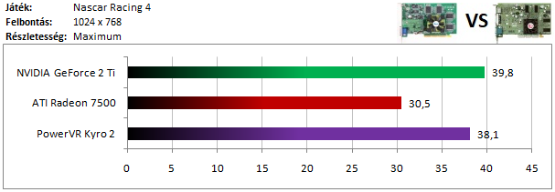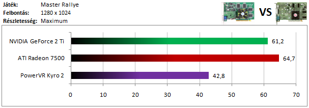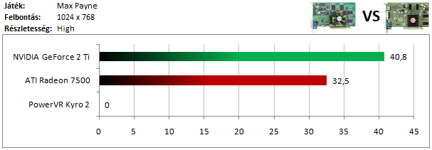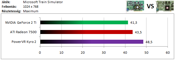 A GeForce 2 viszonylag nagy előnnyel vezet a Radeon 7500 előtt, míg a Kyro 2-vel lefagyott a program.