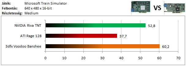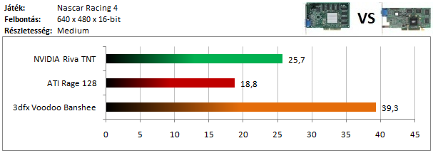 A legkisebb kártyák között a TNT nagy arányú győzelmet arat a V-Sync limitbe futó Rage 128 és a textúrahibákat produkáló Banshee előtt.