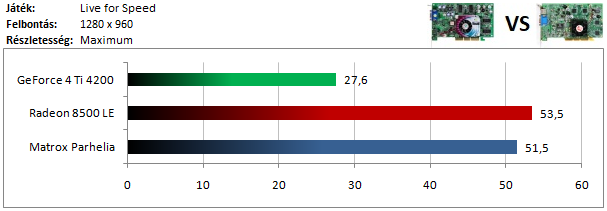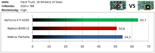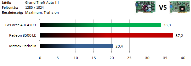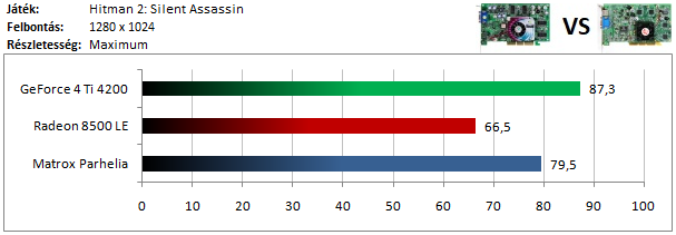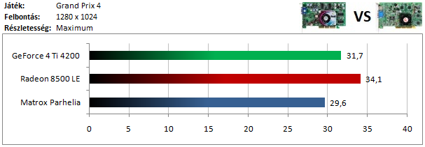 A GeForce 4 nyerte ezt a tesztet, de a viszonylag gyengén szereplő Radeon 8500-at a Parhelia is megelőzte.