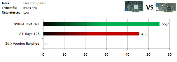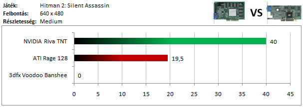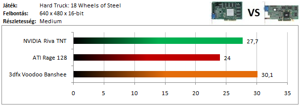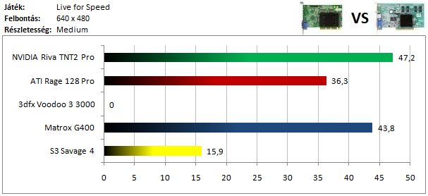 A TNT2 hatalmas fölénnyel nyeri ezt a tesztet. Mivel a játék csak 32 bites színmélységet támogat, ezért a Voodoo 3 nem képes futtatni, a többi versenyző pedig nem szerepel túl fényesen.