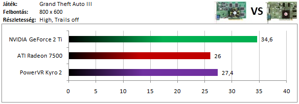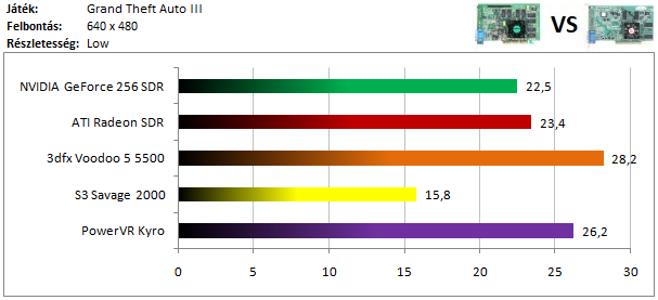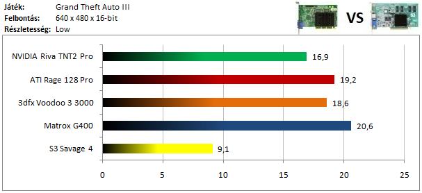 Az előző kártyacsoport lesújtó eredményeit látva egyértelmű volt, hogy ezekkel a kártyákkal már nem reménykedhetünk folyamatos játékmenetben, de sokaknak ekkoriban nem volt más választása, a GTA3-at pedig mindenképpen ki kellett próbálni. A Matrox G400 tulajdonosai jártak a legjobban, mögötte a mostanában sokszor gyengélkedő Rage 128 Pro végzett. A TNT2 nem szerepelt túl fényesen, a Savage 4-gyel pedig esélyünk sincs még csak megközelítőleg élvezhető sebesség elérésére sem. Az ennél is gyengébb kártyákon már nem láttam értelmét próbálkozni a játék futtatásával.