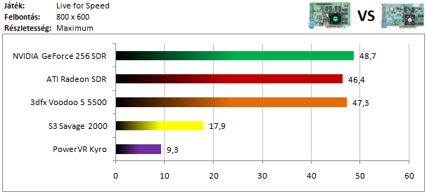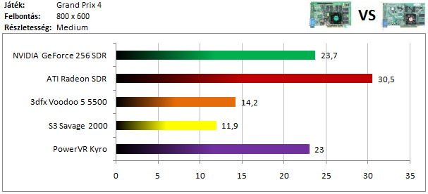 A második kártyacsoportban jóval nagyobb a Radeon előnye a GeForce előtt, de a Kyro még így sem tudja tartani velük a lépést.