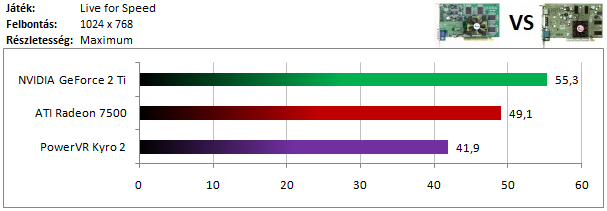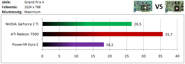 A második kártyacsoporttal már a felbontás csökkentésére, és a "Trails" effekt kikapcsolására volt szükség, de még ilyen beállítások mellett is csak a GeForce volt képes játszható sebességet elérni.