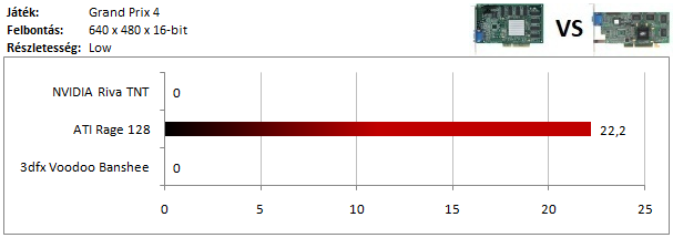 Az utolsó csoportban a Rage 128 egyedüliként szerepel, hiszen a TNT-vel és a Banshee-val is lefagyott a program. Ennek ellenére az ATI kártya tulajdonosai sem lehetnek maradéktalanul boldogak, hiszen a legalacsonyabb minőségi szinten sem kapnak játszható sebességet.