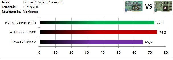 A második csoportban visszavágott az ATI, hiszen ha kis különbséggel is, de a Radeon 7500 legyőzte a GeForce 2-t. Ezúttal a Kyro 2 lemaradása sem drámaian magas.
