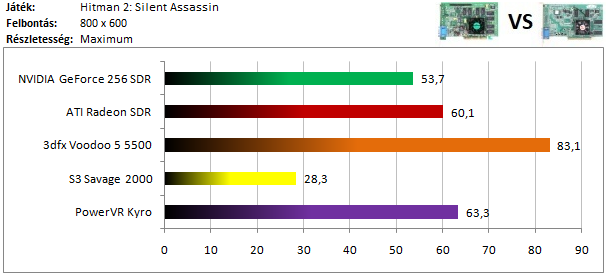 A TNT2 kis mértékű előnyt tudott kiépíteni a második helyen befutó Matrox G400-hoz képest, de a Rage 128 Pro lemaradása már jelentős. A Savage 4 teljesen használhatatlan sebességgel futtatta a játékot, de még nála is rosszabbul járt a Voodoo 3, amivel (valószínűleg ezúttal is a 32 bites színmélység támogatásának hiánya miatt) el sem indult a program.