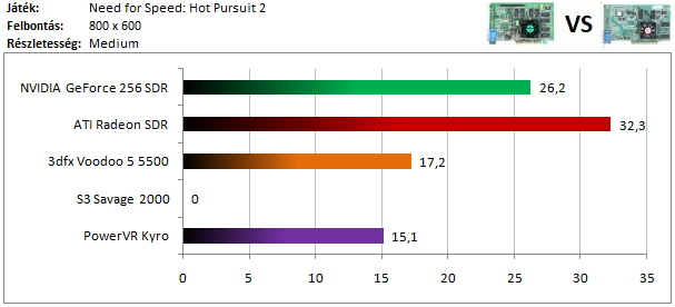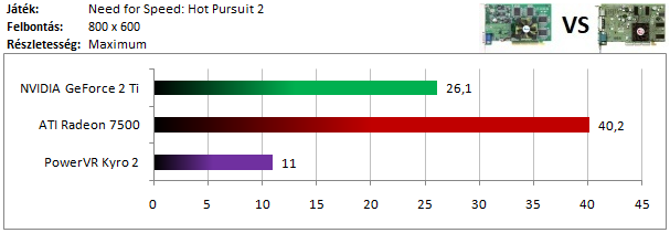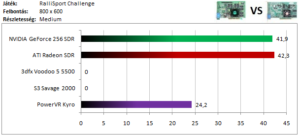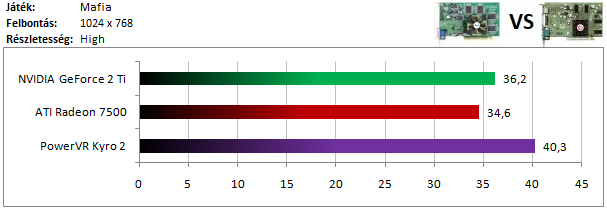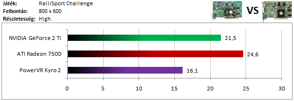 A második kártyacsoportban is nagymértékű NVIDIA-fölény tapasztalható, hiszen a Radeon 7500-at még a Kyro 2 is utolérte.