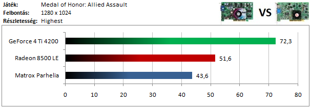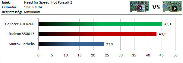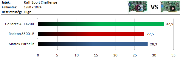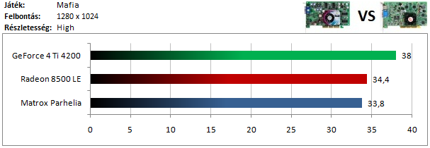 A GeForce 4 csak kis mértékű előnyre tud szert tenni a Radeon 8500 ellen, de a Parhelia-t mindketten nagyon megverik.