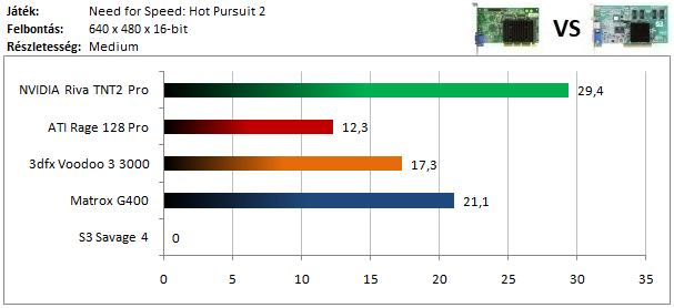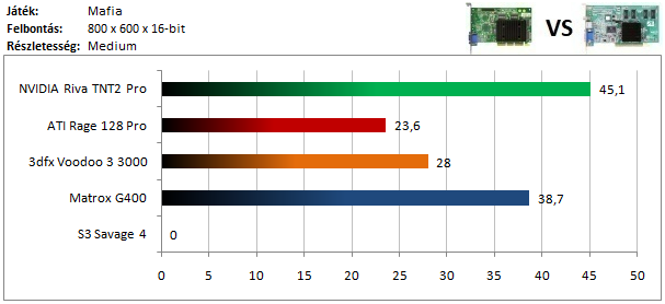 A TNT2 hatalmas fölénnyel vezeti a kategóriáját, és egyedül ő képes játszható sebességet elérni a tesztelt beállításokkal. A Voodoo 3 textúrahibákat produkált, a Savage 4-en pedig lefagyott a program.