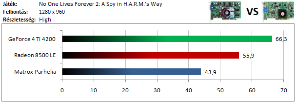 A GeForce 4 nagyjából ugyanakkora előnnyel vezet a Radeon 8500 előtt, mint amekkora különbséggel az ATI versenyzője megverte a Parhelia-t.