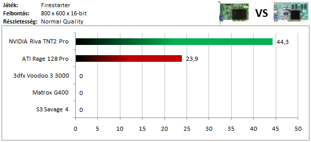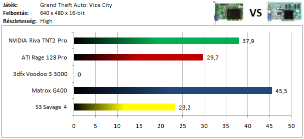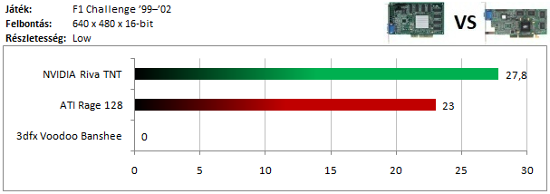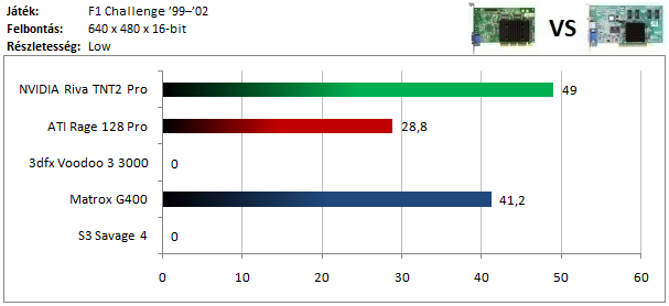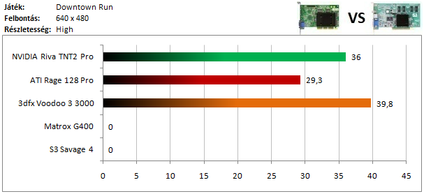 A Voodoo 3 nyeri a saját kártyacsoportját, bár felmerül a kérdés, hogy a többi versenyző milyen színmélységben renderelt, hiszen erre vonatkozó beállítás nincs a játékban. A TNT2 jócskán megverte a Rage 128 Pro-t, melynek a képe is csúnya, furcsán kemény volt. A Matrox G400-zal vertex hibák után fagyás következett be, a Savage 4 pedig nagyobb testvéréhez hasonlóan hard reset-elte a gépet.