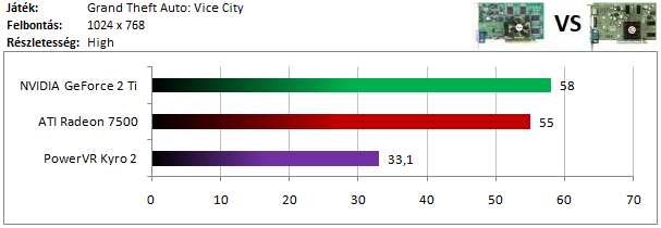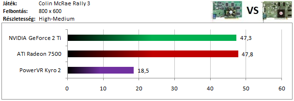 A Kyro-val lefagyott a program, valószínűleg a felbontás váltást nem szerette, mert a menü 800x600-ban fut. A Radeon 7500-al pedig a világítás megvalósítása volt kissé furcsa, valahogy túl erősek voltak az utcai lámpák fényei. Sebesség tekintetében sincs sok büszkélkedni valója az ATI versenyzőjének, hiszen jócskán kikap a GeForce 2-től.