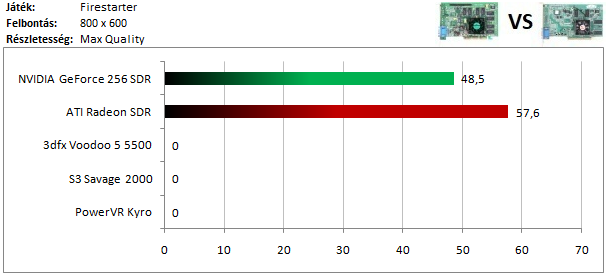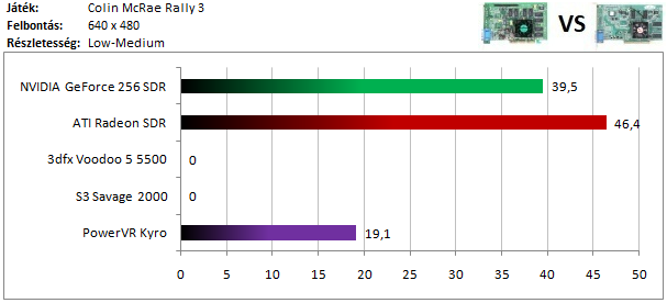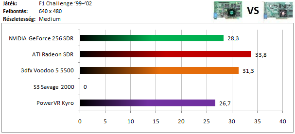 A Voodoo 5 és a Savage 2000 kártyákkal már nem indult el a játék, és a Kyro-val is csak az emulált HW T&L miatt volt képes futni. A Radeon előnye ezúttal szemmel látható a GeForce előtt.