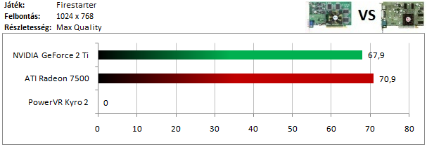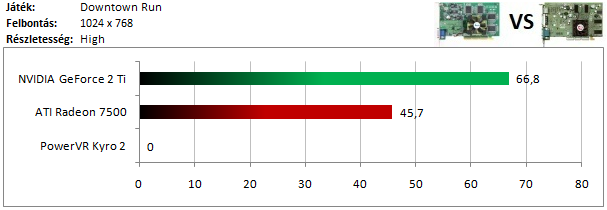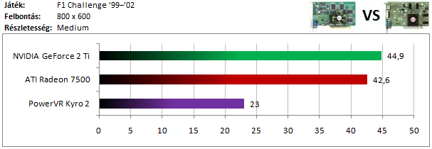 A DX7-es kártyák között magára talált az ATI, és a Radeon 7500 szinte azonos sebességre volt képes, mint a GeForce 2. A Kyro lemaradása viszont hatalmas, annak ellenére, hogy a grafika minőségét már közepes szintre csökkentettem.