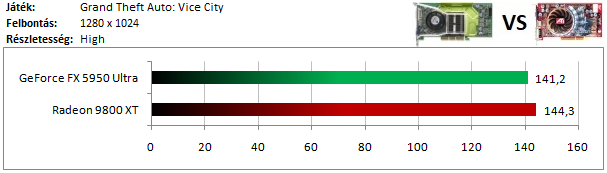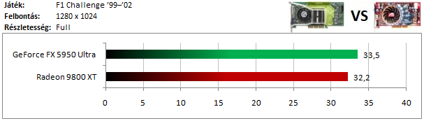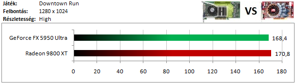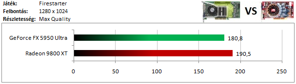 Az FX egy kis mértékű előnyre képes szert tenni a 9800 XT-vel szemben, jól mutatva, hogy nyers erő tekintetében nincs szégyenkeznivalója, amennyiben nem túl shaderintenzív játékkal találja magát szemben.