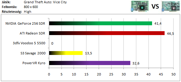 Az erősebbik DX7-es kártyák között kis mértékű NVIDIA-fölény mutatkozik, de a Kyro lemaradása hatalmas.