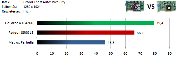 A DX8-as kártyák között a shaderek hiányának ellenére is hatalmas különbségek alakulnak ki. A GeForce vezet a Radeon előtt, de a Parhelia még jobban lemaradva zárja a sort.