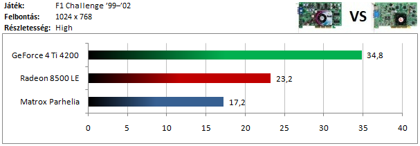 A DX8-as kártyák csoportjában is hatalmas előnyre tesz szert a GeForce, és ezúttal a Parhelia lemaradása kisebb a Radeon-hoz képest, mint amennyivel a vörös versenyző kapott ki az éllovastól.