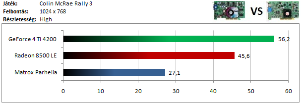 A DX8-as kártyák mezőnyében is masszív NVIDIA-fölény mutatkozik, de a Parhelia lemaradása még ennél is nagyobb.