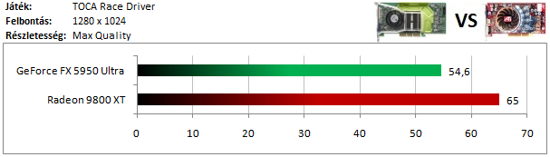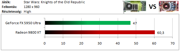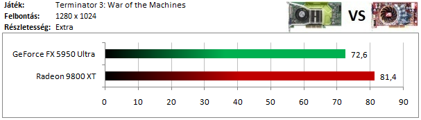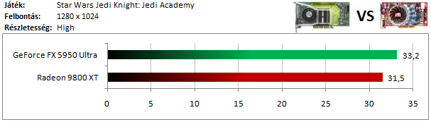 Az FX kis mértékben megveri a 9800 XT-t ebben a játékban, de mindkét kártya éppen csak játszható sebességre képes maximális részletesség mellett.