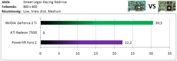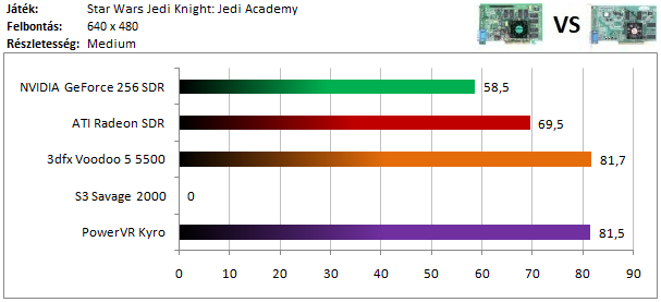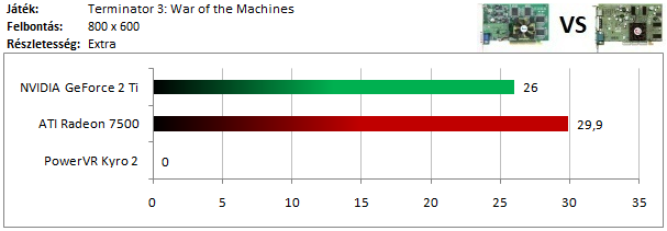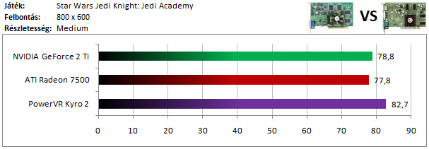 A Radeon 7500-on lefagyott a program, a Kyro-val pedig elég gyengén futott, így a GeForce 2 nyeri ezt a tesztet.
