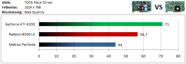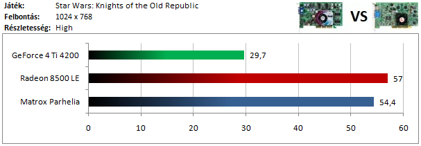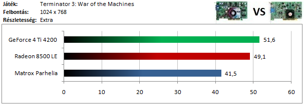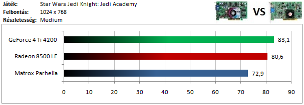 A DX8-as kártyák között is nagyon gyengén szerepelt az NVIDIA versenyzője, hatalmas hátrányt összeszedve nem csak a Radeon 8500-zal, de a Parhelia-val szemben is.
