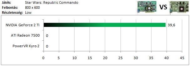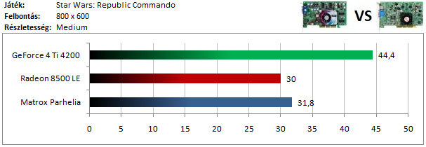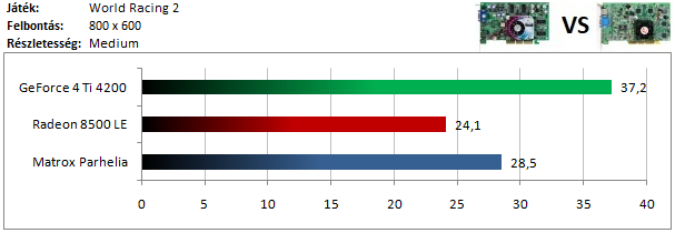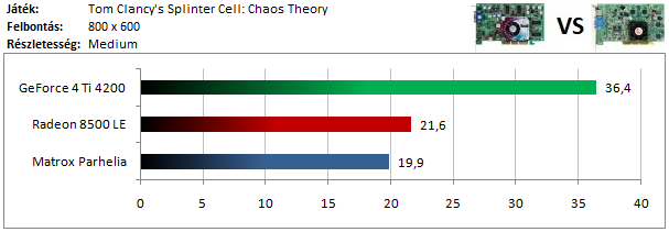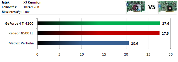 A GeForce 4-en nem fagyott a játék, de a sebességgel már akadtak gondok, így a Radeon 8500 nyeri ezt a tesztet. A Parhelia-n viszont nem futott a program, mint ahogy az ennél régebbi típusokon sem.