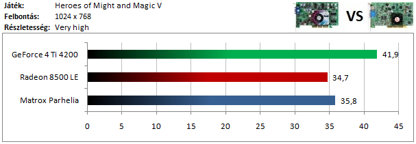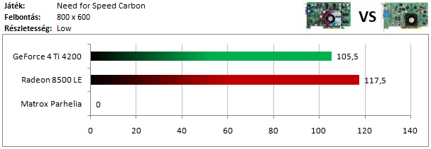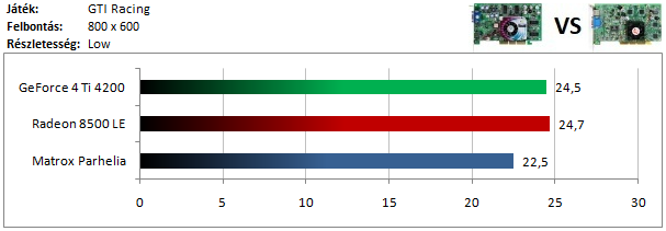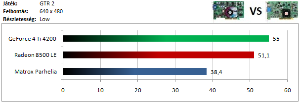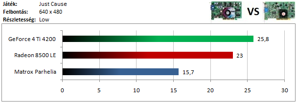 A DX8-as kártyák csoportjában már csak az alacsony minőségi szintet állíthatjuk be. A GeForce 4 előnye kisebb a megszokottnál a Radeon 8500 előtt, de a Parhelia már jócskán lemarad tőlük.