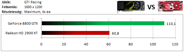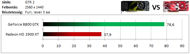 Ismét egy olyan mérési eredményt kaptunk, ahol a 8800 GTX dupla akkora teljesítményre képes, mint a HD 2900 XT. Régivágású grafika, és élsimítással ötvözött nagy felbontású renderelés esetén ez az erőviszony várható a két DX10-es nagyvas között.