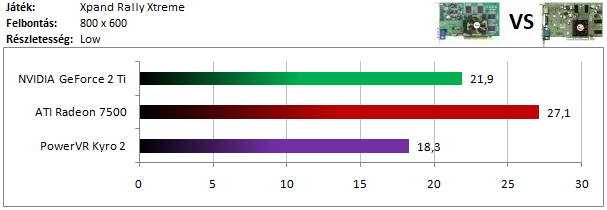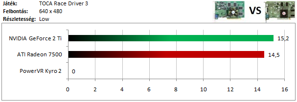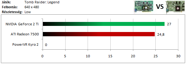 A DX7-es GPU-k nem képesek játszható sebességet elérni a legalacsonyabb minőségi szinten sem. A Radeon 7500 előnye látványos, de ezúttal nem maradt le nagyon a Kyro sem.