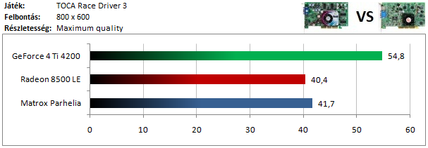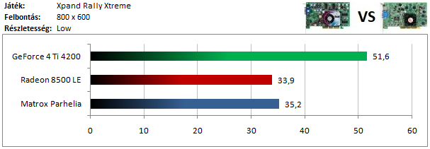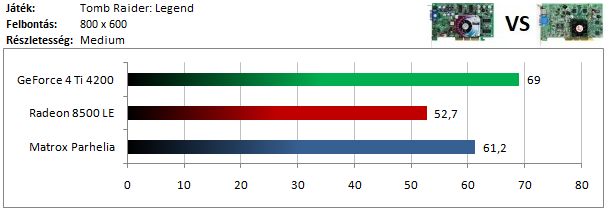 A GeForce 4 kimagasló fölénnyel vezeti a DX8-as kártyák kategóriáját, míg a Radeon 8500-at a Parhelia is megelőzi egy hajszálnyival.