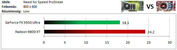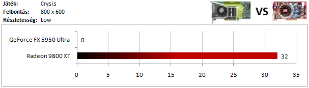 Az FX-et nemes egyszerűséggel nem támogatott kártyának titulálja a program, és nem indul el vele, így csak a 9800 XT szerez pontot, de ő is éppen csak játszható sebességre képes a legalacsonyabb minőségi szinten.