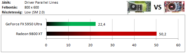 Az SM 2.0 üzemmódot az FX még alacsony részletességi szint mellett is csak játszhatatlan sebességgel képes futtatni, így a 9800 XT hatalmas fölénnyel nyeri ezt a tesztet.