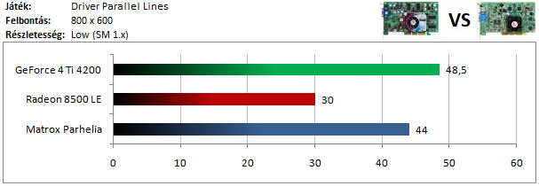 A GeForce 4 jócskán megverte a Radeon 8500-at ebben a játékban. A Parhelia jónak látszó eredménye megtévesztő lehet, ugyanis a renderelt grafika ezer sebből vérzett: a textúrák össze-vissza villództak, a menü olvashatatlan volt, és a shader effektek mintha egyáltalán nem lettek volna megjelenítve.
