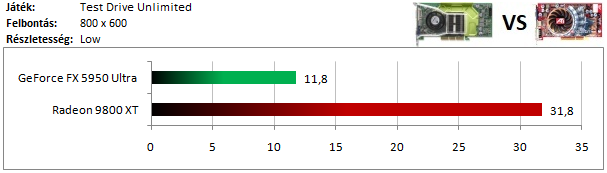 A legalacsonyabb részletesség mellett játszható sebességet kapunk a 9800 XT-vel, de az FX 5950 Ultra-val erre esélyünk sem lesz.