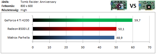 A GeForce 4 nyeri a DX8-as kártyák kategóriáját, míg a másik két versenyző egymáshoz nagyon közeli eredményt ért el.